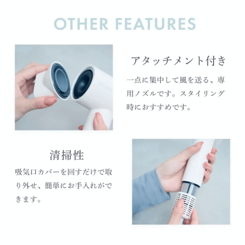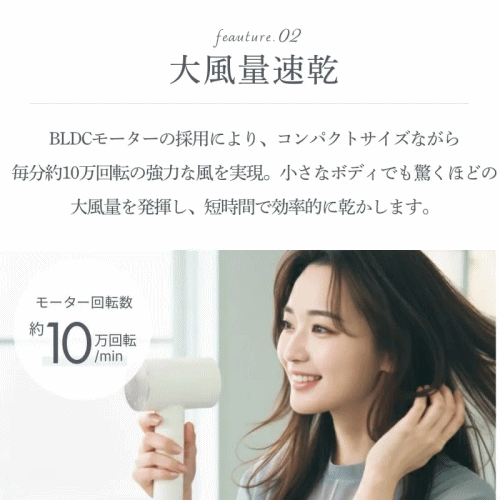 BLDCモーターの採用により、コンパクトサイズながら毎分約10万回転の強力な風を実現。小さなボディでも驚くほどの大風量を発揮し、短時間で効率的に乾かします。