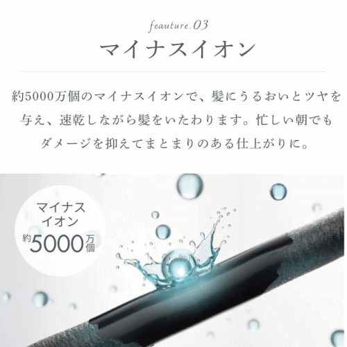 約5000万個のマイナスイオンで、髪にうるおいとツヤを与え、速乾しながら髪をいたわります。忙しい朝でもダメージを抑えてまとまりのある仕上がりに。