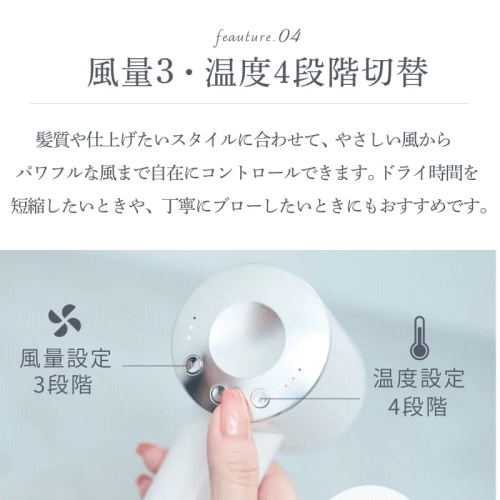 髪質や仕上げたいスタイルに合わせて、やさしい風からパワフルな風まで自在にコントロールできます。ドライ時間を短縮したいときや、丁寧にブローしたいときにもおすすめです。