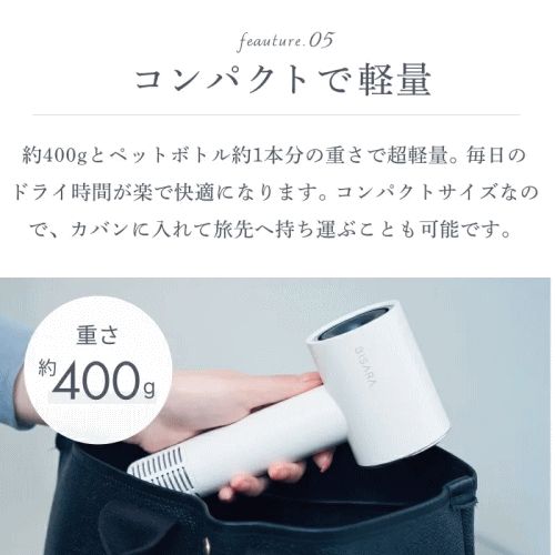 約400gとペットボトル約1本分の重さで超軽量。毎日のドライ時間が楽で快適になります。コンパクトサイズなのでカバンに入れて旅先へ持ち運ぶことも可能です。