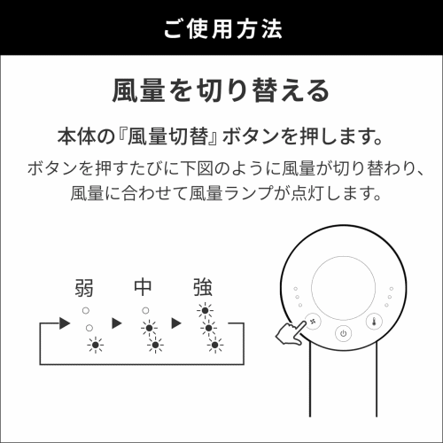 ・風量を切り替える…本体の『風量切替』ボタンを押します。ボタンを押すたびに風量が切り替わり、風量に合わせて風量ランプが点灯します。