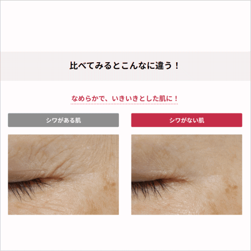 シワ部位をうるおいでやわらかくし、力強いハリ感をあたえ、持続させる処方。1回の使用でシワがのばされたようなハリ感が持続します。